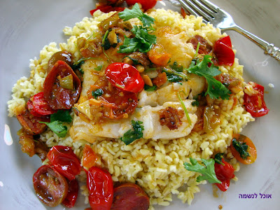 דג קוד על מצע בורגול ותבשיל קטן של עגבניות שמש