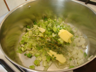 מניחים את הבצל , הפרסה , והשום בסיר רחב. מוסיפים שמן זית וחמאה ותימין ומזהיבים.