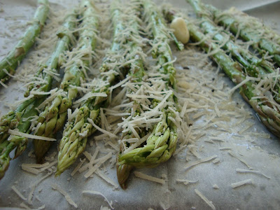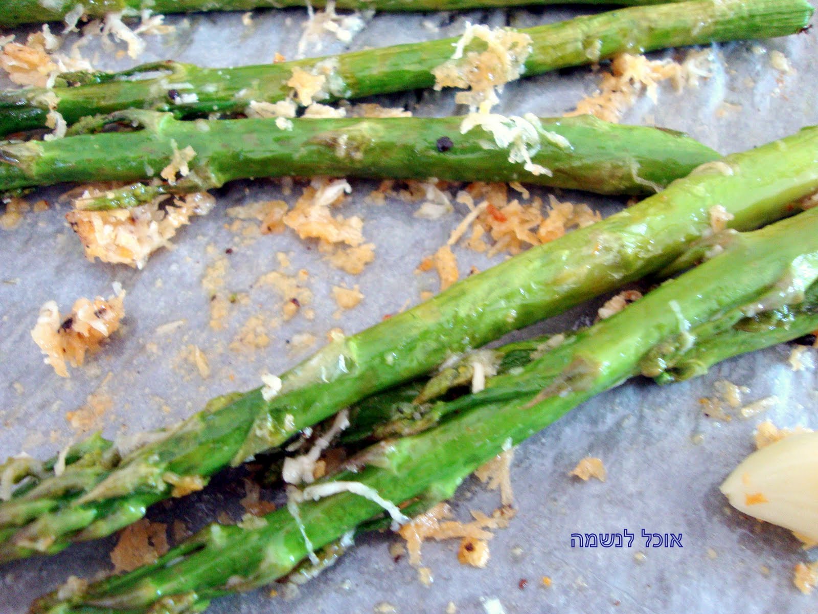 מזליפים 1 כף שמן (מהשלוש) ומפזרים את הפרמזן המגוררת . מפרידים בין גבעולי האספרגוס , ממליחים מעט ומפלפלים , מוסיפים גם את שן השום השלמה.