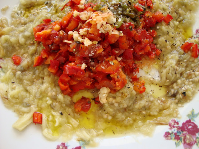 מקלפים את הפלפלים , חותכים לקוביות קטנות . מערימים במרכז הצלחת , מפזרים מעל את שן השום הקצוצה .