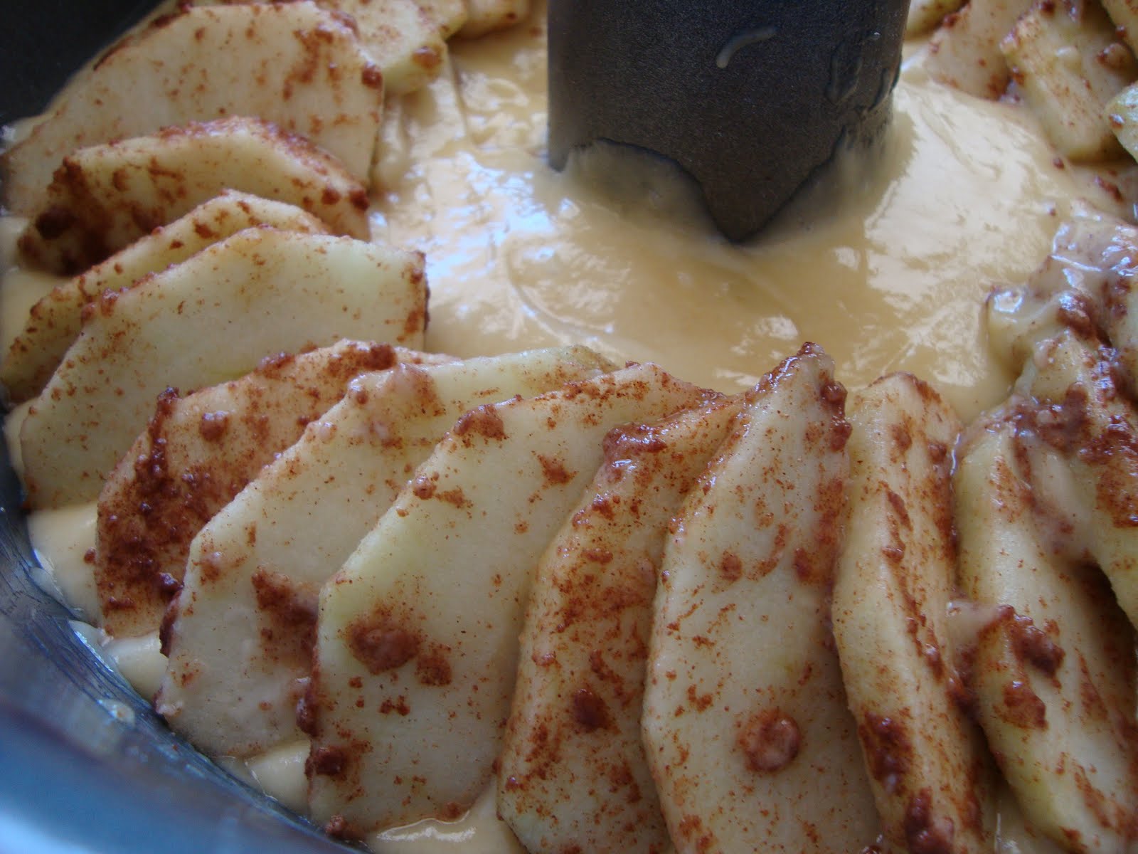 יוצקים מעל את המחצית השנייה של תערובת העוגה , ומסדרים יפה את שאר התפוחים ,שוב מבלי שהם יבואו במגע עם הדפנות.